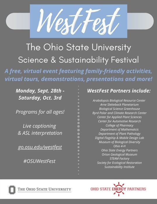 Join the Ohio State University from Sept. 28 through Oct. 3 for six days of exciting, family-friendly online events showcasing sustainability and outreach at Ohio State! Open to people of all ages, from children to seniors. Check out the program at https://go.osu.edu/westfest.